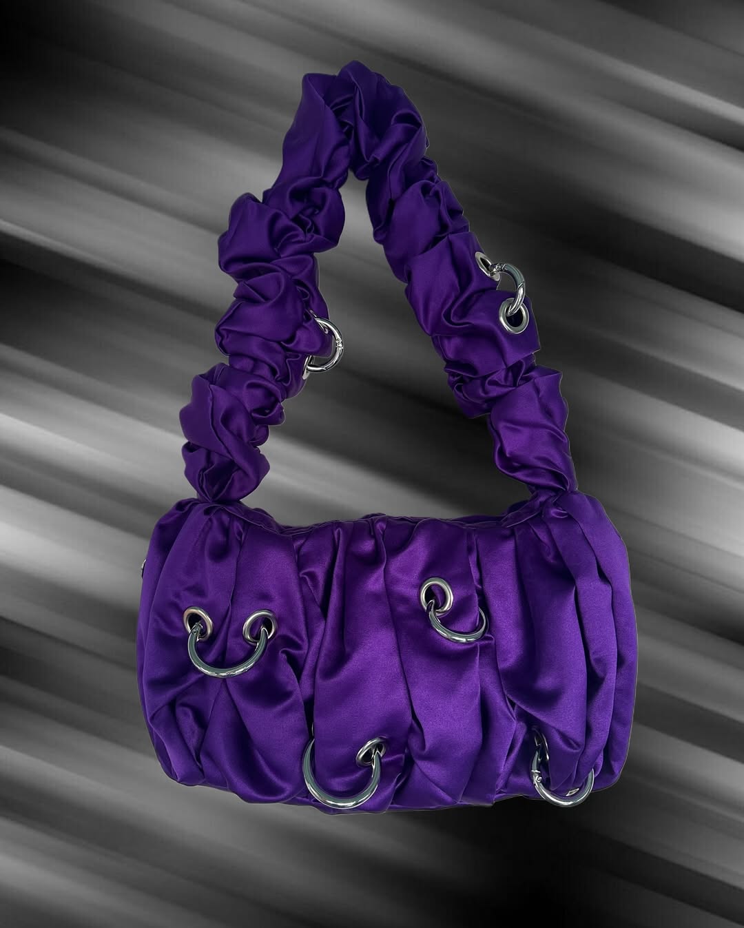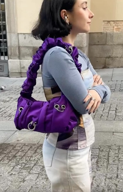 Bag with voluminous ruffled design, embellished with metallic piercings made of large hoops. It has an inside pocket and metal clasp. It is designed and handmade in Madrid by a team of women.