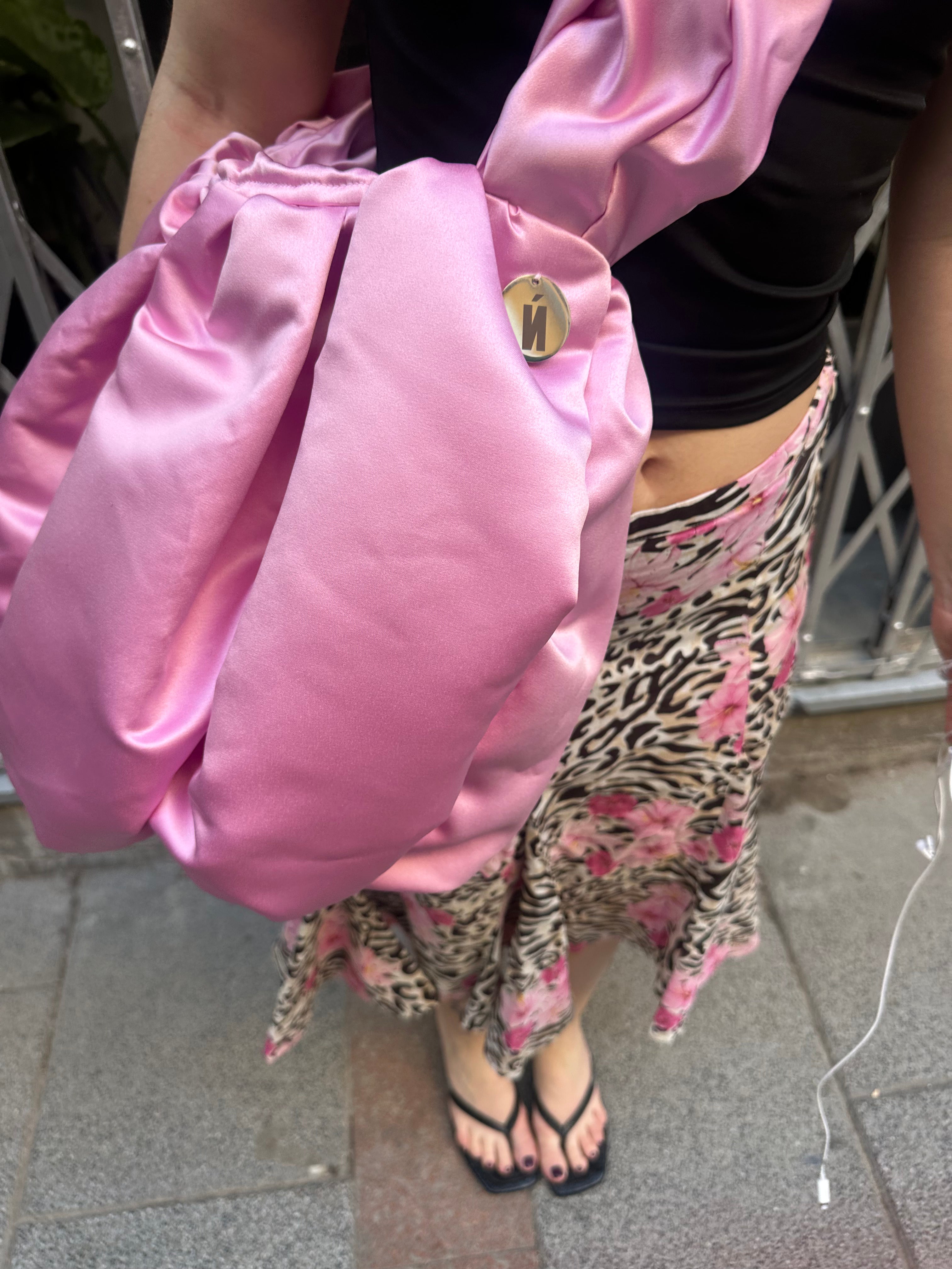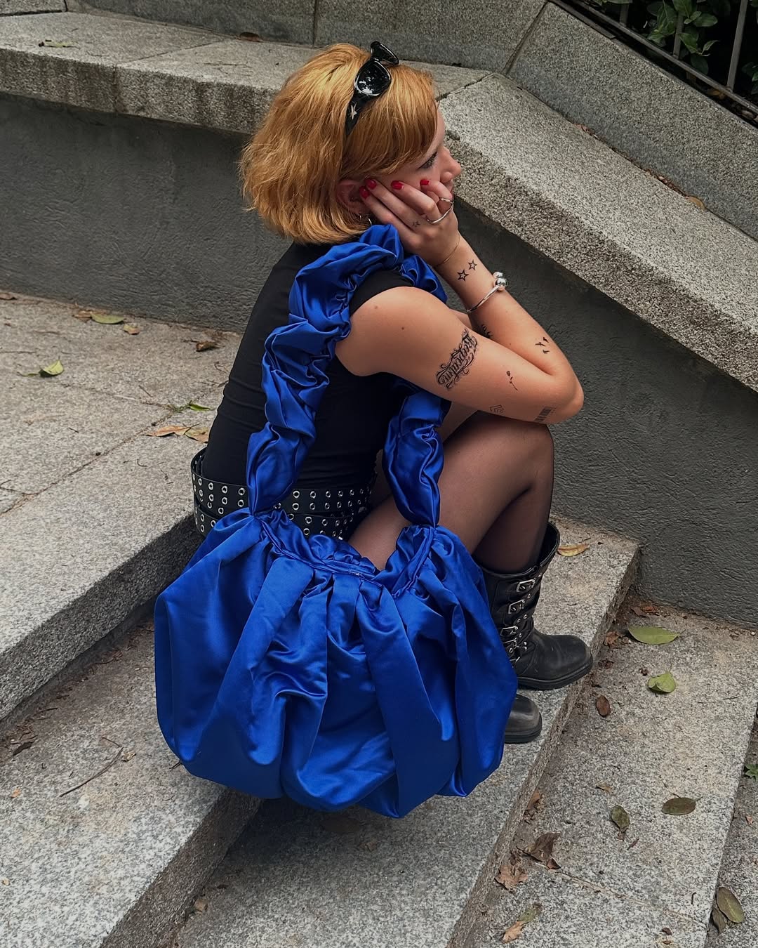 Bag with a voluminous design and ruffled satin fabric. It has a large size and large interior capacity. It can be worn over the shoulder or crossed as a shoulder bag. Inside it has a small pocket and closes with a metal clasp.