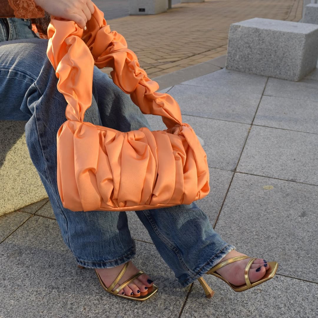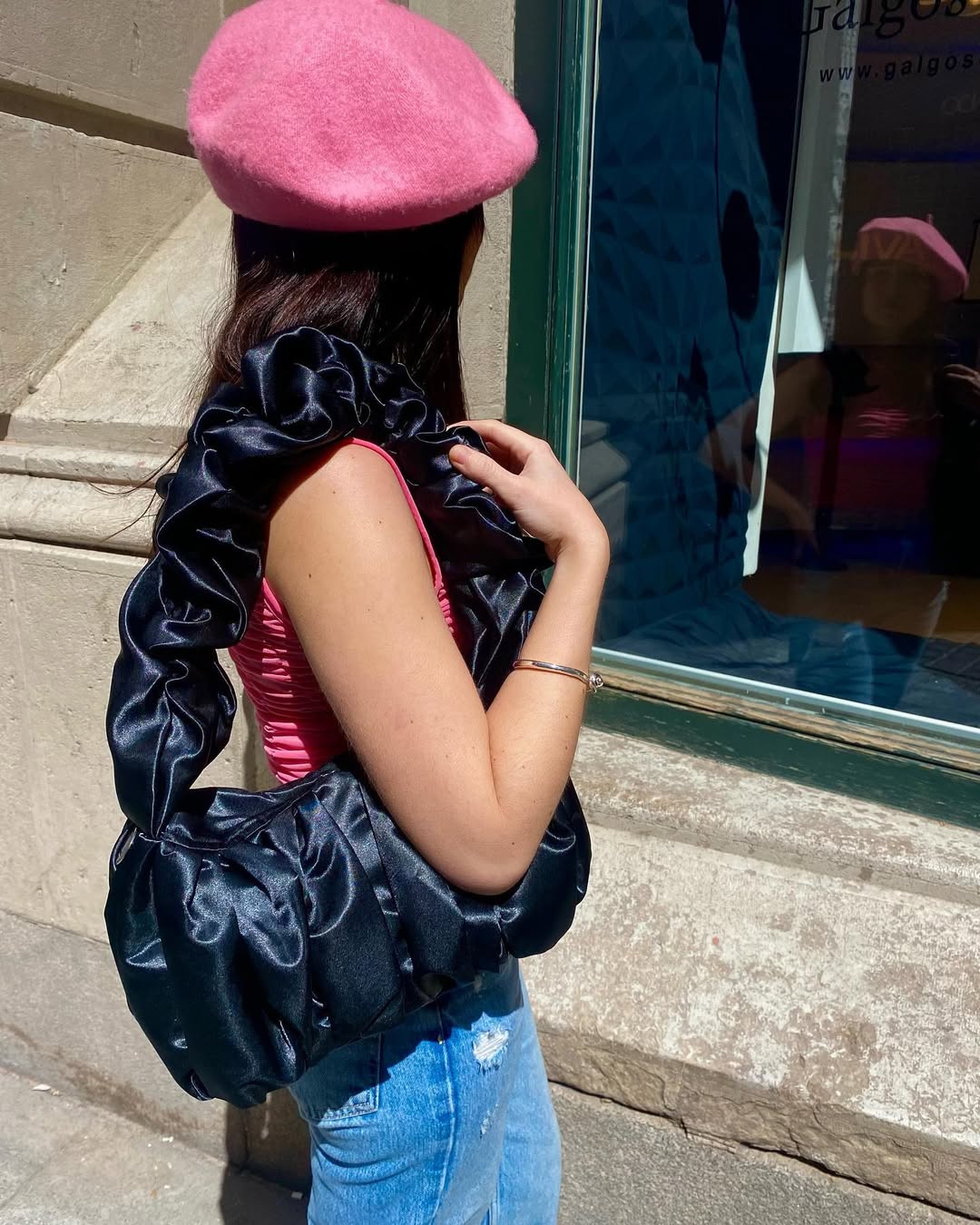 Bag with a voluminous design and ruffled satin fabric. It can be worn over the shoulder. Inside it has a small pocket and closes with a metal clasp.
